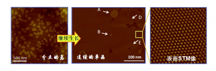 圖2. a: 六方氮化硼光學(xué)顯微鏡照片;b: 六方氮化硼34K與33K溫度下的低溫原子力顯微鏡形貌圖,當溫度34K時存在氣泡(圖中亮色部分);c: 六方氮化硼氣泡不同溫度下的高度,當溫度33K時氣泡消失