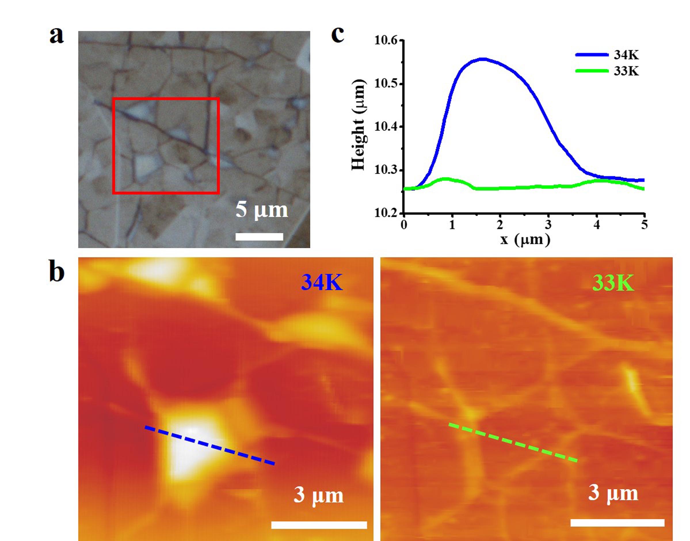 圖2. a: 六方氮化硼光學顯微鏡照片;b: 六方氮化硼34K與33K溫度下的低溫原子力顯微鏡形貌圖,當溫度34K時存在氣泡(圖中亮色部分);c: 六方氮化硼氣泡不同溫度下的高度,當溫度33K時氣泡消失