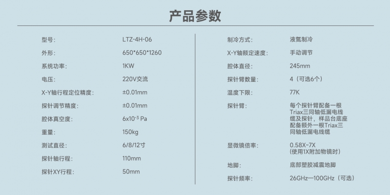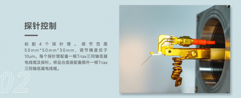 2. 探針控制:標配4個探針臂。調節(jié)范圍50mm*50mm*30mm,調節(jié)精度優(yōu)于10um。每個探針臂配備一根Triax三同軸低漏電線纜及探針。樣品臺底座配備額外一根Triax三同軸低漏電線纜;