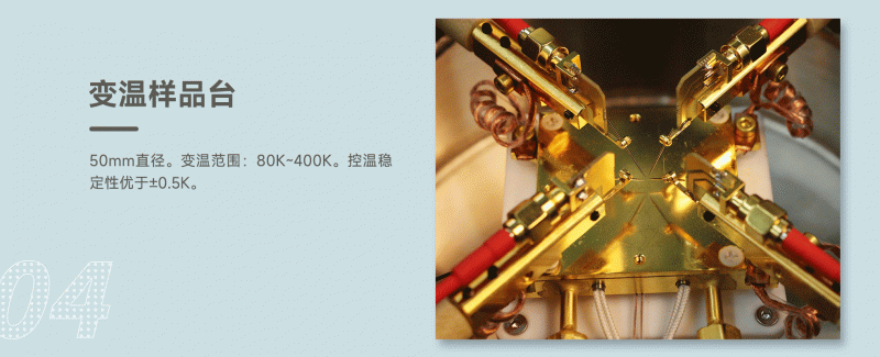 4. 變溫樣品臺:50mm直徑。變溫范圍:80K~400K??販胤€(wěn)定性優(yōu)于±0.5K;