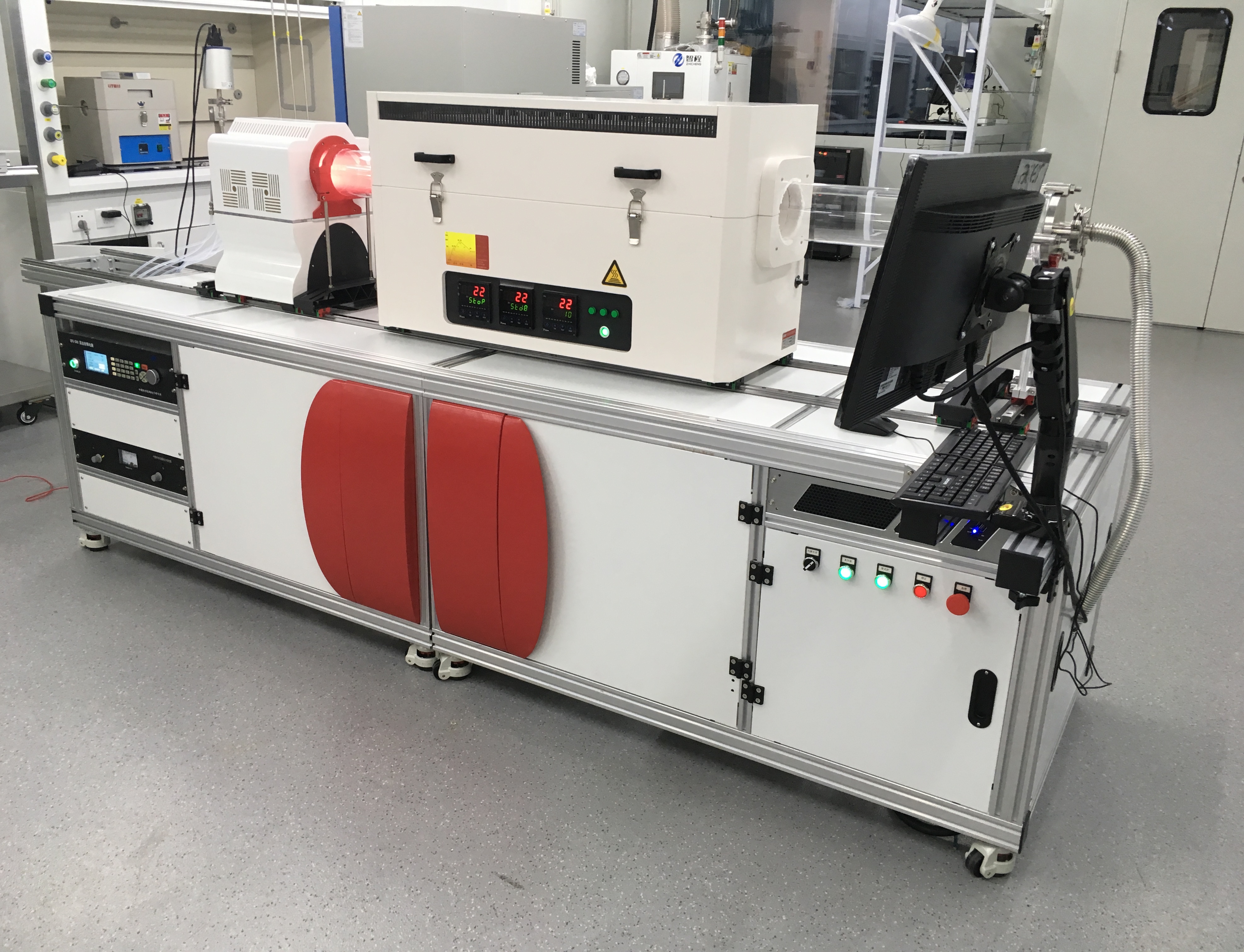 等離子體增強化學(xué)氣相沉積系統(tǒng)(PECVD),三溫區(qū)CVD系統(tǒng),生長樣品腔的管徑60-120mm,它是由高溫管式爐、多路高精度流量控制與供氣系統(tǒng)、機械泵、真空密封及測量系統(tǒng)、尾氣處理系統(tǒng)組成,極限真空度可達 10^-5 torr 。